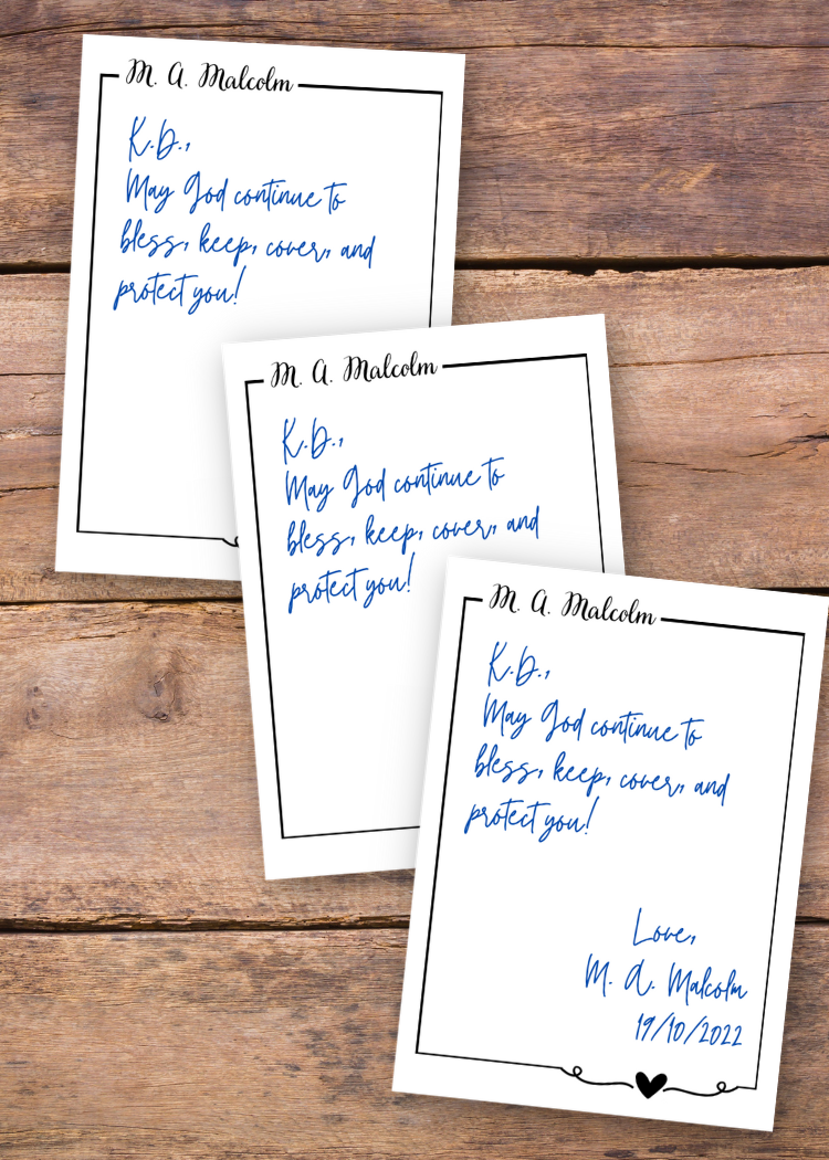 You'll receive THREE (3) signed adhesive paper bookplates in the mail. Remove the backing and stick the bookplates inside the front covers of your M. A. Malcolm books.