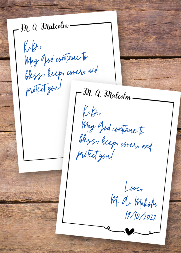 You'll receive TWO (2) signed adhesive paper bookplates in the mail. Remove the backing and stick the bookplates inside the front covers of your M. A. Malcolm books.